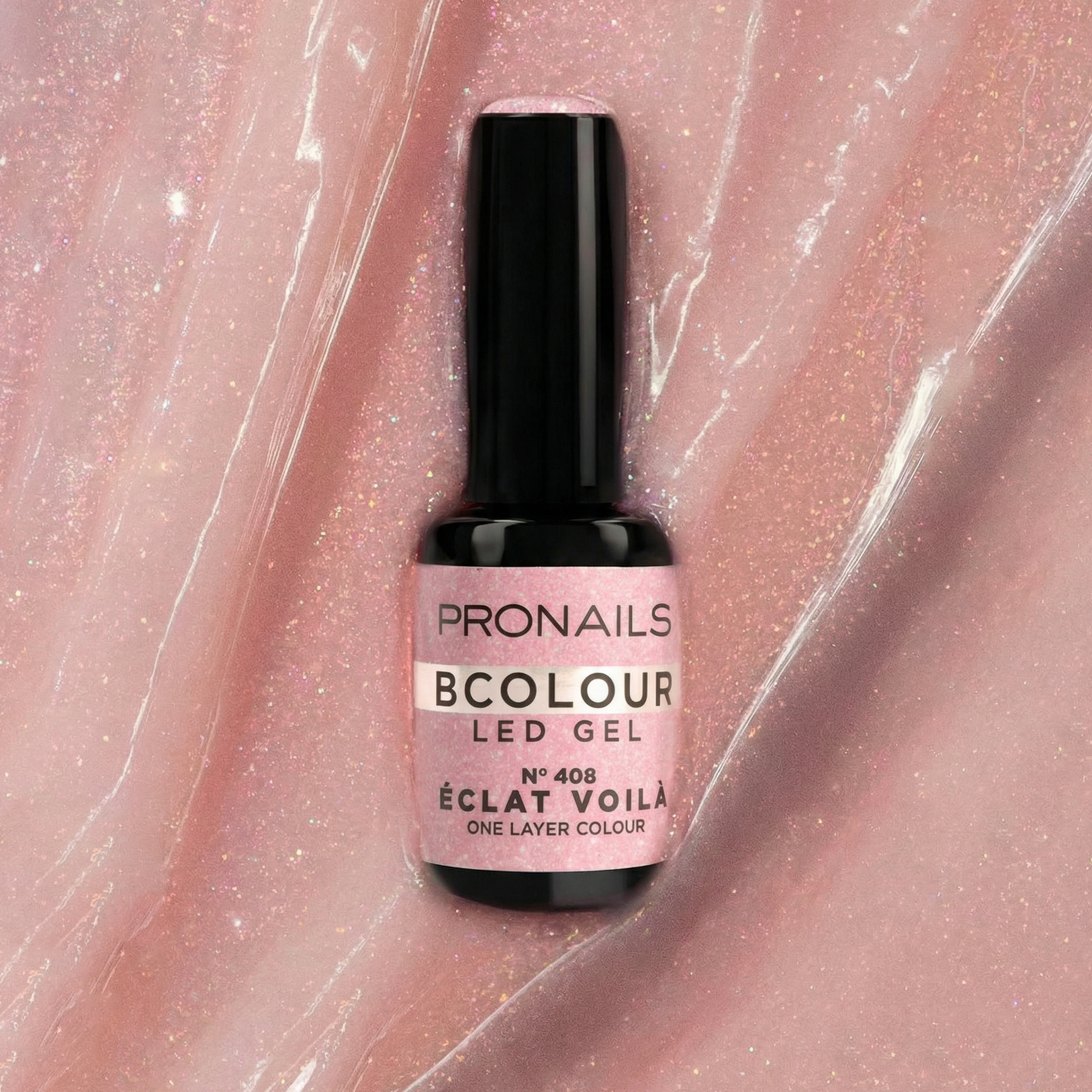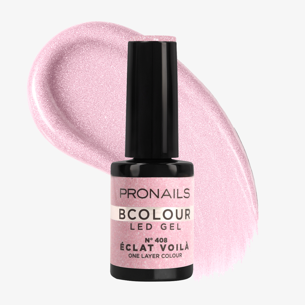 Faites pétiller la manucure avec BCOLOUR 408 Éclat Voilà, la teinte scintillante de la collection Printemps-Été 2026 Pronails. Ses paillettes rose pêche captent la lumière comme une coupe de champagne à l’heure dorée, pour un effet lumineux, chic et irrésistiblement glamour.