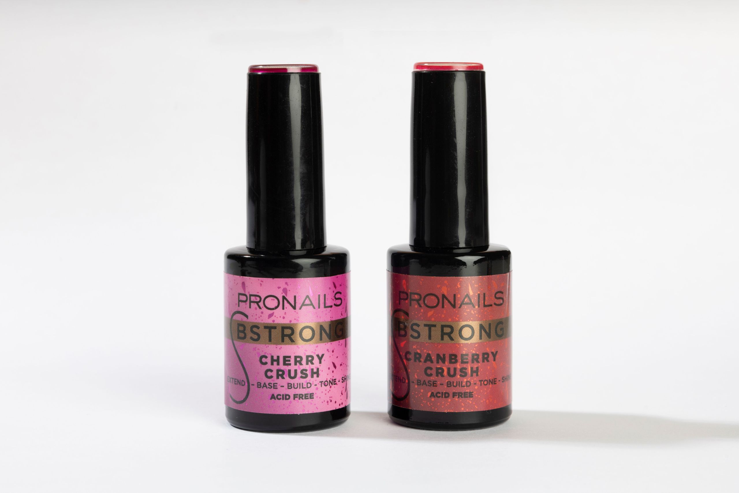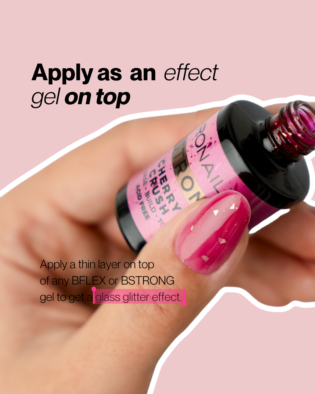 *Les photos présentent également le BStrong Led Gel Cranberry Crush mais ce produit est vendu séparément. Le BSTRONG LED GEL CHERRY CRUSH 14ml correspond au packaging rose et à la teinte la plus claire.