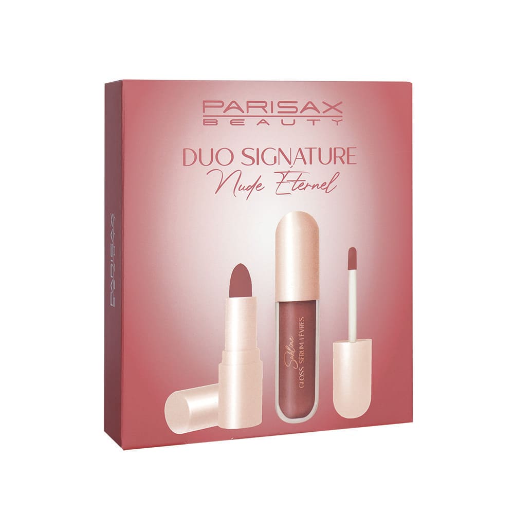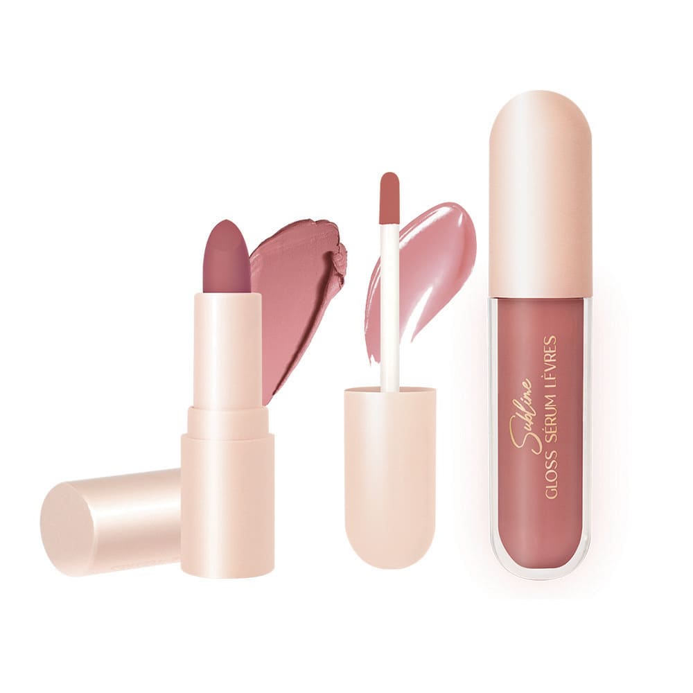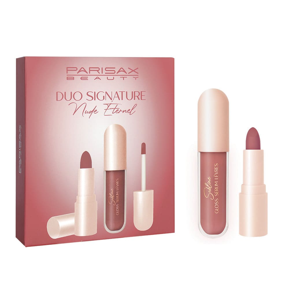 Coffret Duo Lèvres Nude Éternel : rouge à lèvres mat intense + gloss éclat.