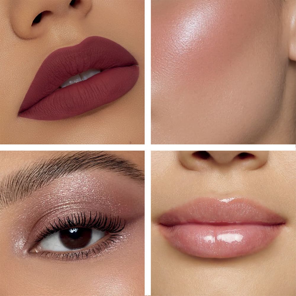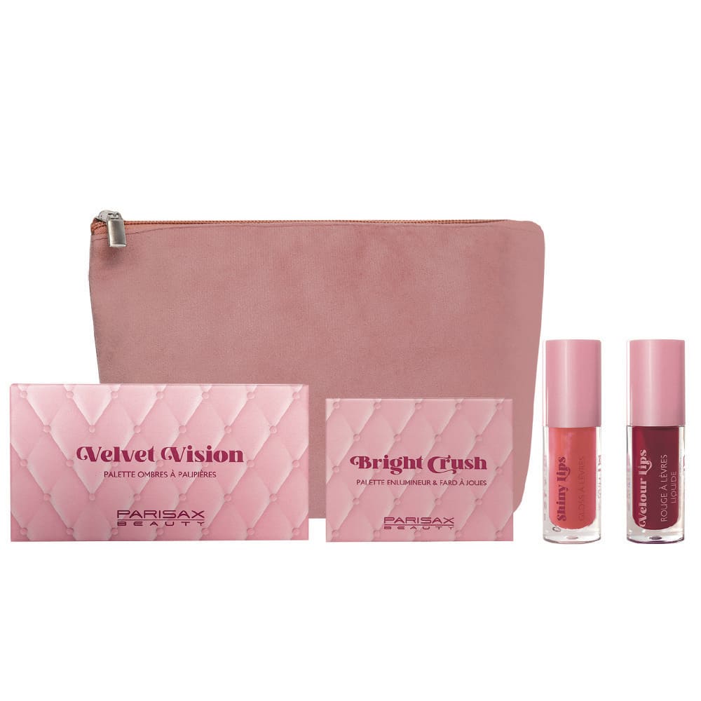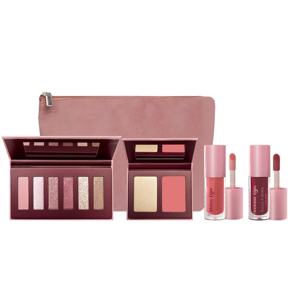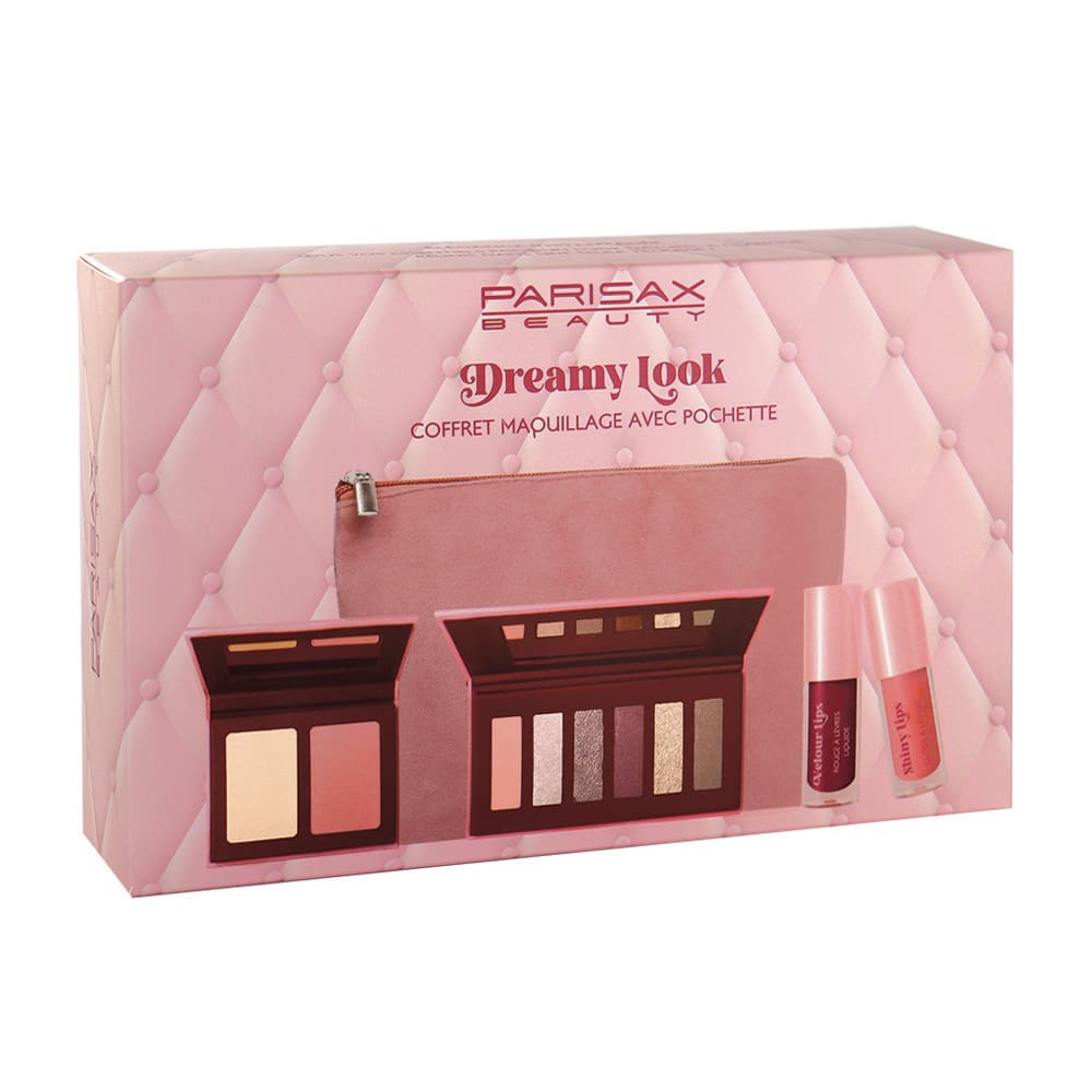 Coffret maquillage complet Dreamy Look : palette yeux, duo teint, rouge à lèvres liquide et gloss.