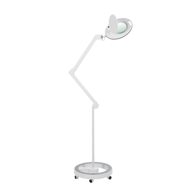 Lampe LED grossissante sur pied avec base 5 roues, bras articulés et loupe en verre. Idéale pour soins esthétiques de précision.