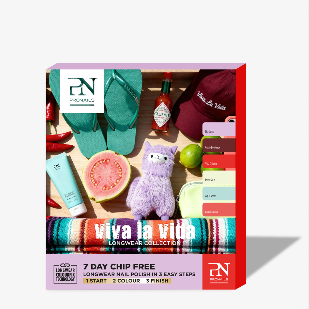 Découvrez la LONGWEAR BOX SS26 VIVA LA VIDA 8 PCS Pronails, une collection énergique de 8 vernis professionnels longue tenue tendance printemps-été aux teintes colorées, lumineuses et vibrantes. Inspirée par la joie de vivre, cette box met en avant des couleurs solaires et modernes pour des manucures pleines de caractère.