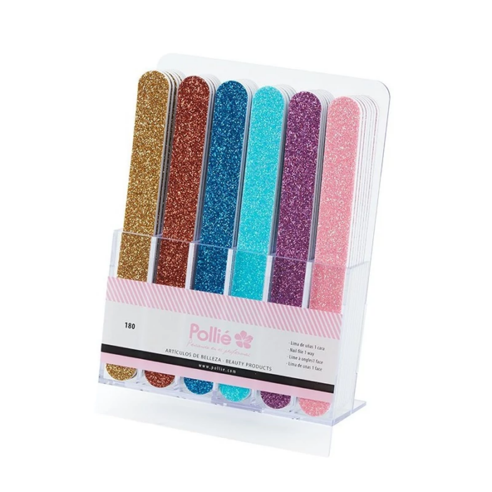 Le présentoir de 42 limes à ongles pailletées est idéal pour les instituts de beauté, salons de manucure et revendeurs esthétiques. Il contient 42 limes pailletés, en couleurs assorties, prêtes à être utilisées ou exposées sur comptoir.