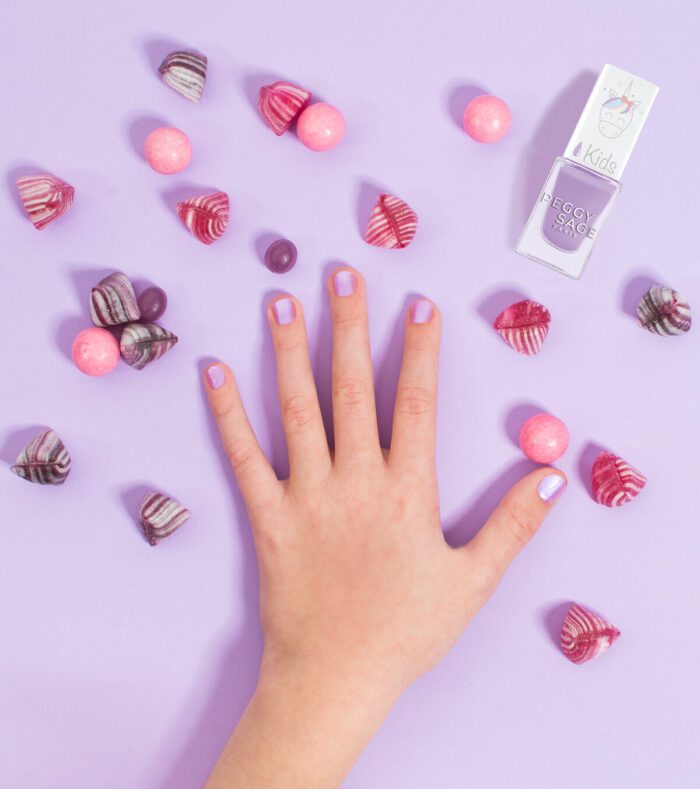 Le vernis Peggy Sage Kids – Melusine, un lilas nacré scintillant inspiré des licornes, spécialement conçu pour des manucures enfantines pleines de magie et de couleurs.